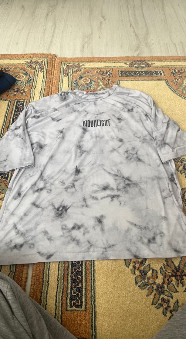 Gri batik desenli erkek tişört, oversize kesim, kısa kollu ve yuvarlak yakalı, pamuklu yumuşak kumaştan. Önünde 'MOONLIGHT' yazısı bulunur. Günlük kullanım için uygun.