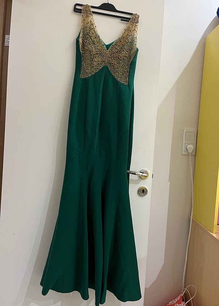 Arkası Kelebek Desenli Zümrüt Yeşili Abiye