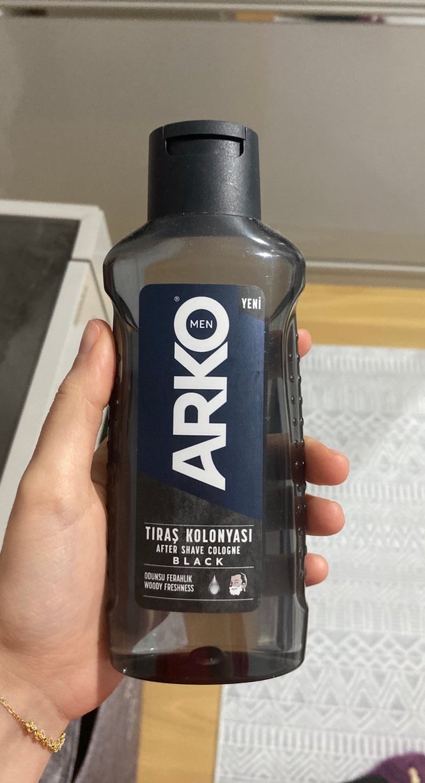 Arko Men Black tıraş kolonyası, tıraş sonrası cildi ferahlatan odunsu bir kokuya sahiptir. Kullanımı kolay şişede sunulur. Eşim çok az kullandı görselde de mevcut