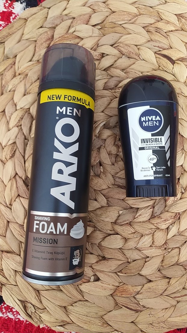 Vitamin E içeren Arko Men tıraş köpüğü pürüzsüz tıraş sağlar. Nivea Men Invisible deodorant ise 48 saat leke ve koku koruması sunar.