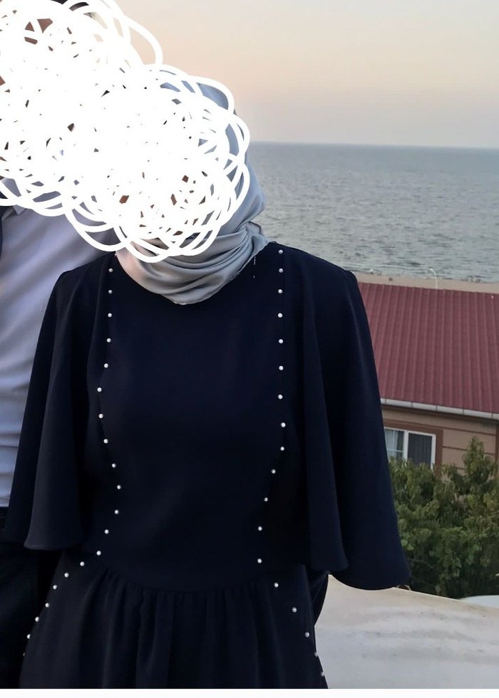 Armağan marka 36 beden, koyu siyaha yakın lacivert, inci detaylı, pileli ve pelerinli, krep kumaş elbise, sadece 2 kez giydim. İki koltuk altı arası 46 cm, boy 127 cm, bir de kemeri var görsele ekleyemedim