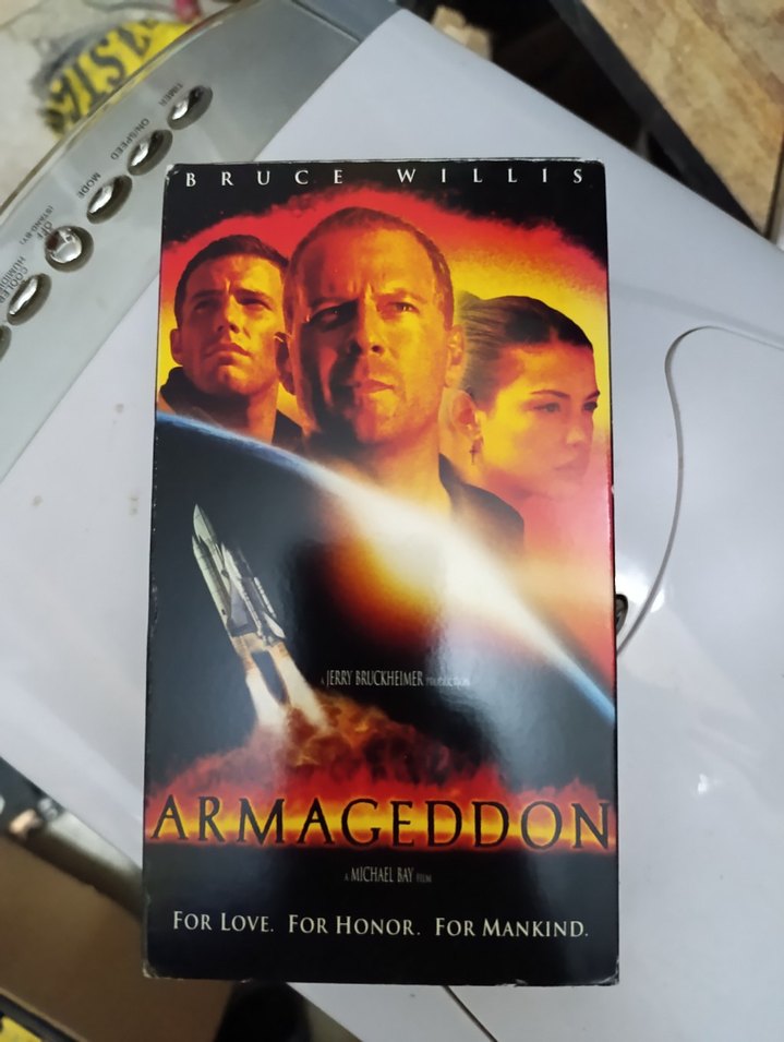 Bruce Willis'lu Armageddon VHS kaseti, 'Aşk için. Onur için. İnsanlık için.' sloganıyla.