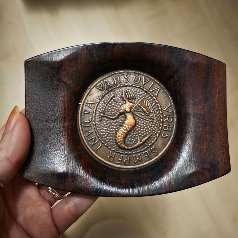 Varşova şehrinin arması ve denizkızı figürüyle süslenmiş, dekoratif bir duvar süsü. Muhtemelen tik ağacından yapılmış bir tahta üzerine monte edilmiştir. Yaklaşık 13 x 9,5 cm. Koleksiyoncular için veya benzersiz bir iç mekan detayı olarak mükemmeldir.