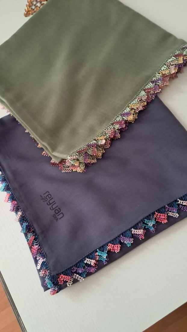 Kadın şalında koyu tonlarda çok renkli tekstil ve zarif dantel detayları bulunur. Modest ve rahat bohem tarzına uygundur. Üzerinde 'reyyan' markası yer alır.