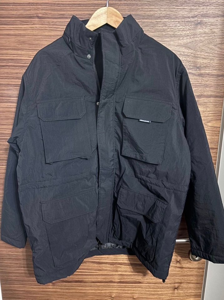 Siyah renk, düğmeli, cep detaylı, erkek streetwear tarzında bol kesim ceket. Uzun kollu ve normal boyda, rahat bir dış mekan görünümü sağlar.