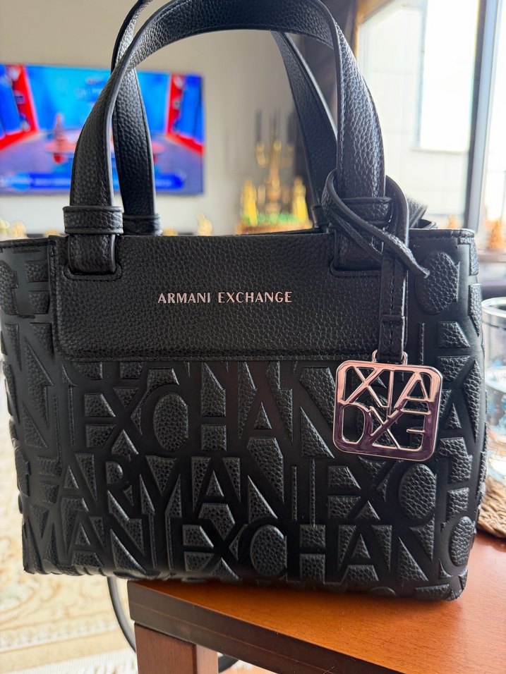 Armani Exchange imzalı siyah deri çanta, kabartma desenli ve tokalı detaylıdır. Sokak stili ve günlük kullanım için uygundur.Askısı biraz soyoldu iç kısımları