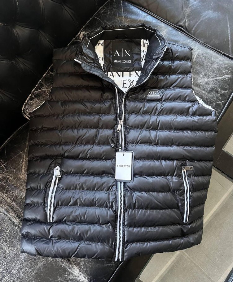 Armani Exchange siyah deri yelek, fermuarlı ve yakalı, dar kesim, günlük sokak stili için uygundur.