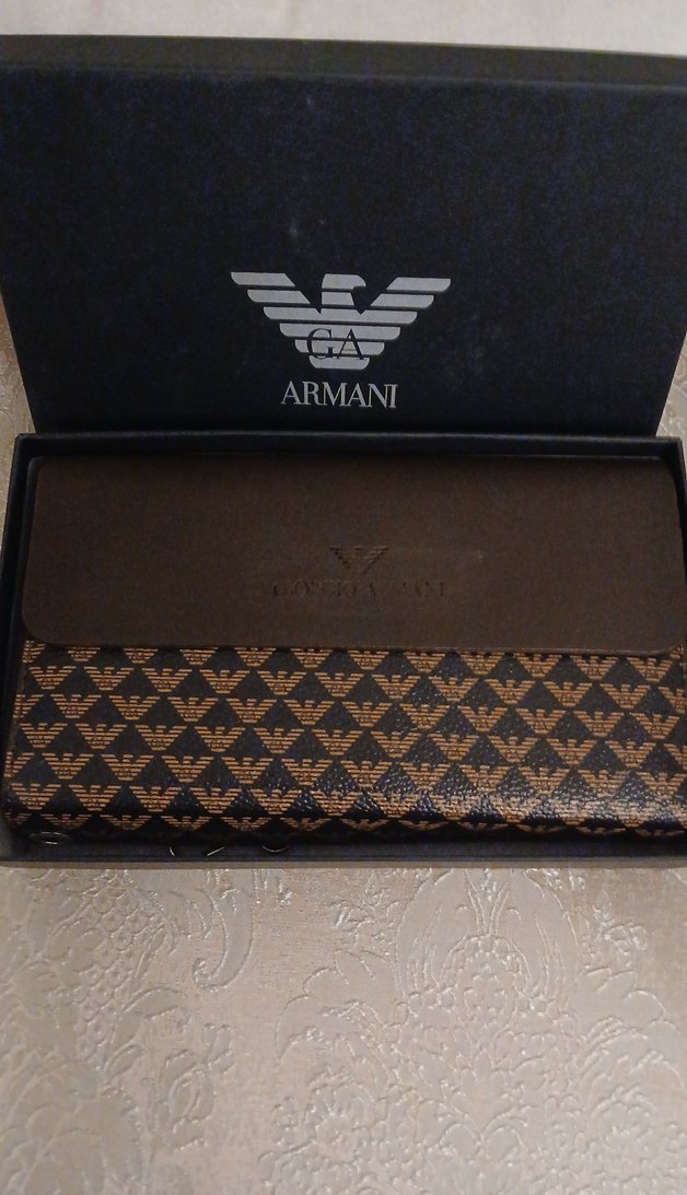 ARMANI marka, kahverengi ve desenli erkek cüzdanı, klasik ve modern iş tarzını yansıtıyor.