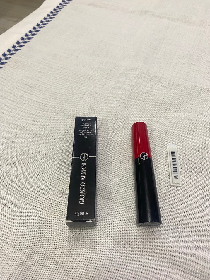Armani Lip Power ruj. Uzun süre dayanıklı saten bitişli harika bir özel gün ruju. Rengi 104. Dünyanın en pahalı ve güzel rujlarından biri. Düğünüm için almıştım ancak düğün makyaj rengime uymadığı için hiç kullanmadım. Hiç kullanılmamış, sadece rengine bakılmış bir ürün. Sephoradaki güncel fiyatını son fotoğrafa ekledim.