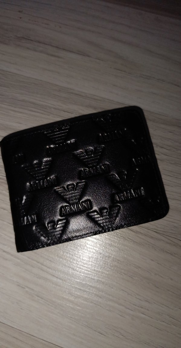 Yumuşak deri üzerinde çoklu Armani logolu baskılı siyah erkek cüzdan, biker tarzında.