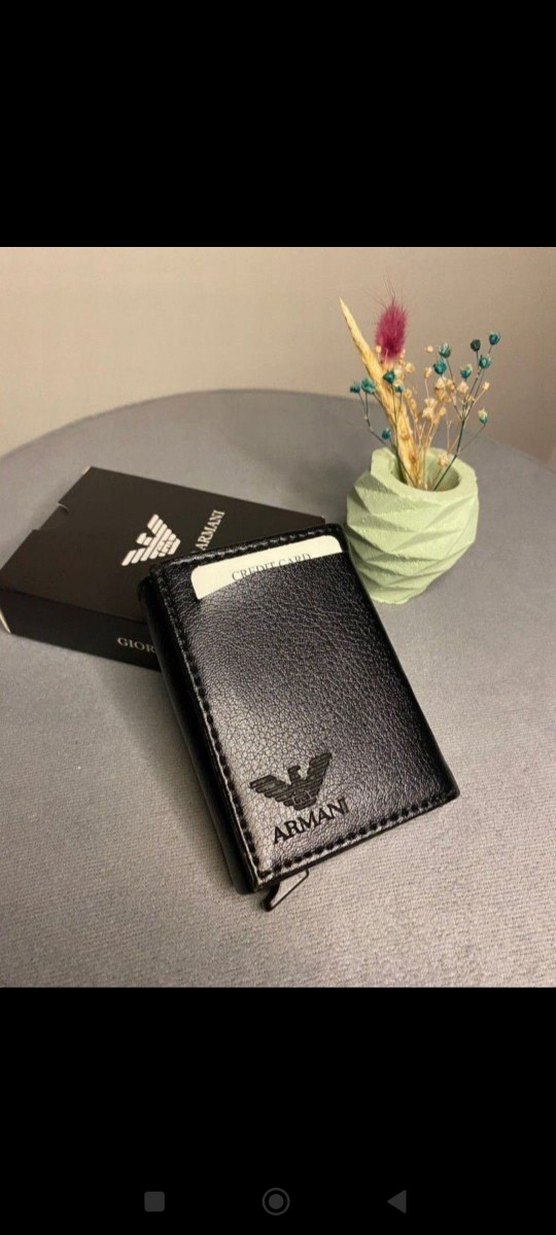Armani erkek cüzdanı, siyah renkli ve baskılı logo detaylıdır. Kart bölmeleri ve kompakt yapısıyla şık ve kullanışlıdır.