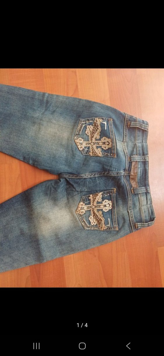 Az kullanılmış, iyi durumda. Nakışlı arka ceplere ve tokalı detaylara sahip, günlük sokak stili için uygun, oturan mavi denim kadın pantolon.