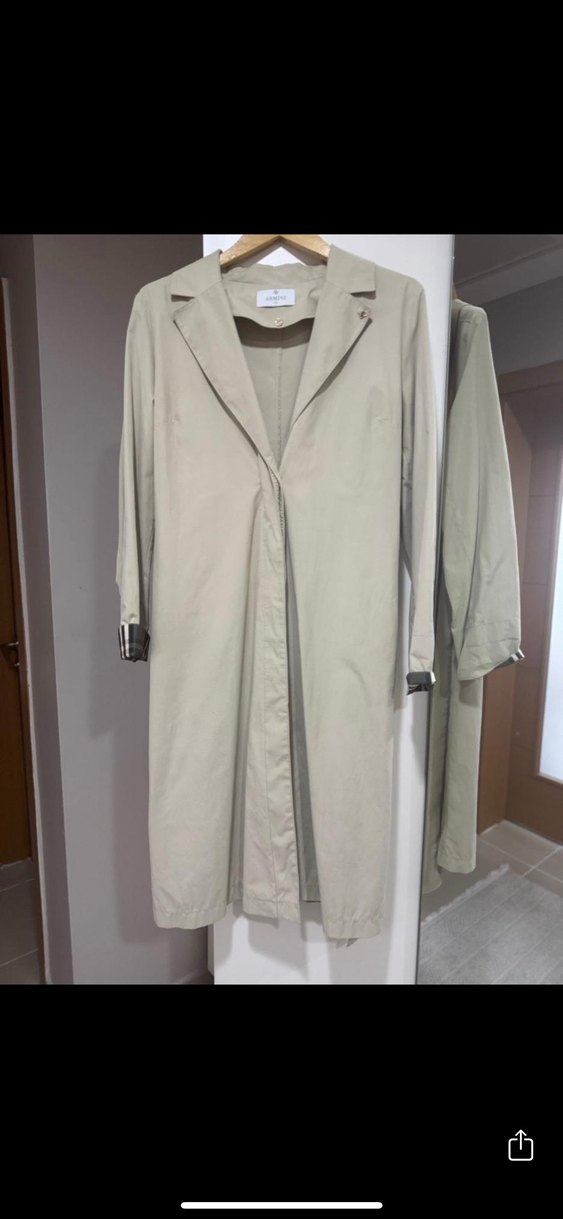 Bej renkli, keten kumaştan uzun kadın trençkot. Klasik yaka ve uzun kollu, ofis ve sokak stili için uygun, rahat kesim ve desensiz.