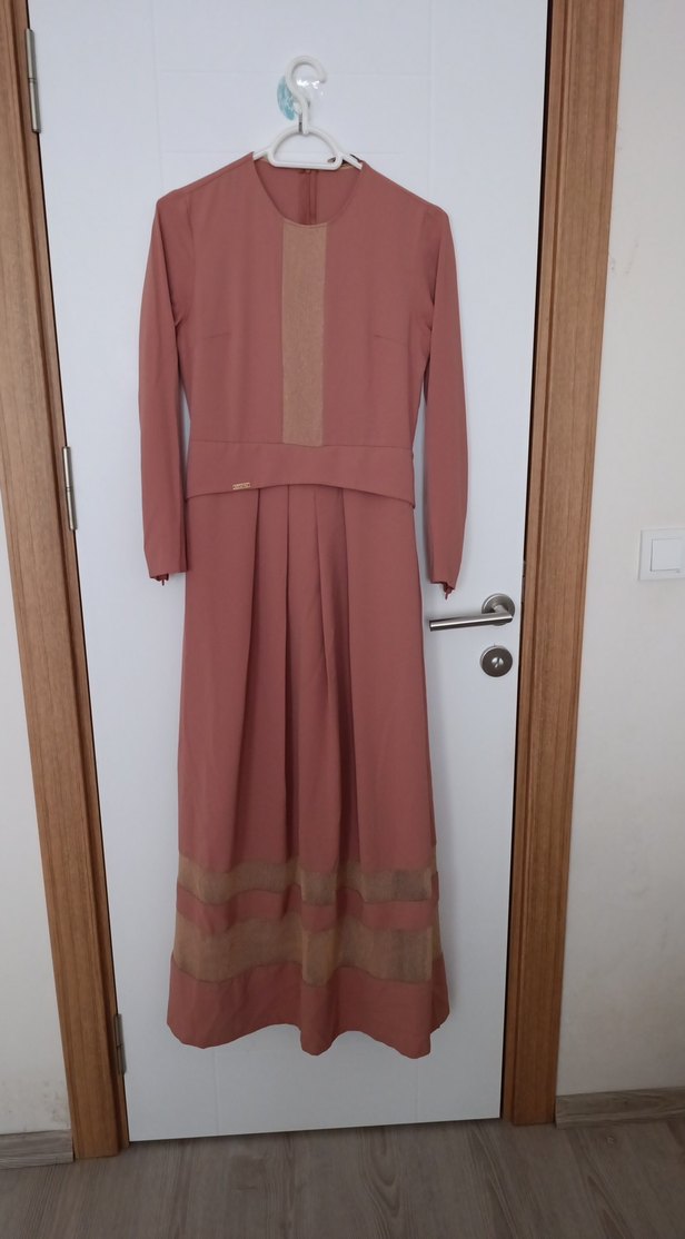 Bej renkli, pilili, uzun kollu ve bisiklet yaka detaylı uzun elbise. Modern klasik tarzda, rahat kesime sahip, yumuşak sentetik kumaştan yapılmıştır.