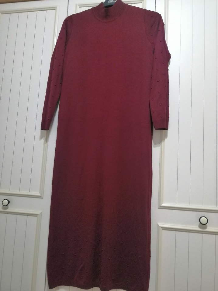 Bordo renkli, yüksek yakalı ve uzun kollu örme kadın elbisesi. Yumuşak yün kumaştan, rahat ve sade tasarıma sahip, günlük kullanıma uygun uzun kesim elbise.