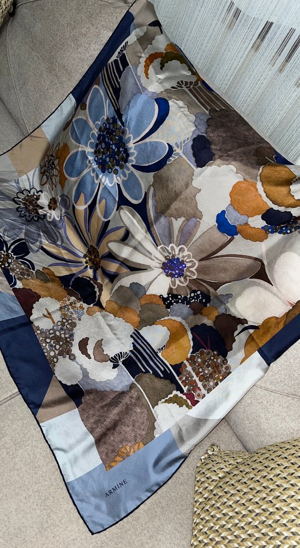 Çiçek desenli, çok renkli ve gri tonlarında yumuşak dokulu, bohem tarzda kadın eşarp Armine