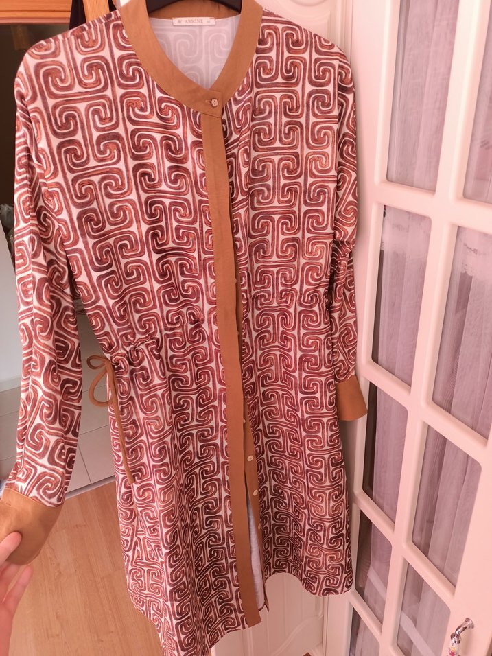 Düğmeli, uzun ve bol kesim kadın tunik, parlak kahverengi batik deseniyle uzun kollu ve hakim yakalıdır.Belinde ayarlanabilir kemeri vardır. Yumuşak sentetik kumaştan yapılmıştır, bohem tarzını yansıtır.