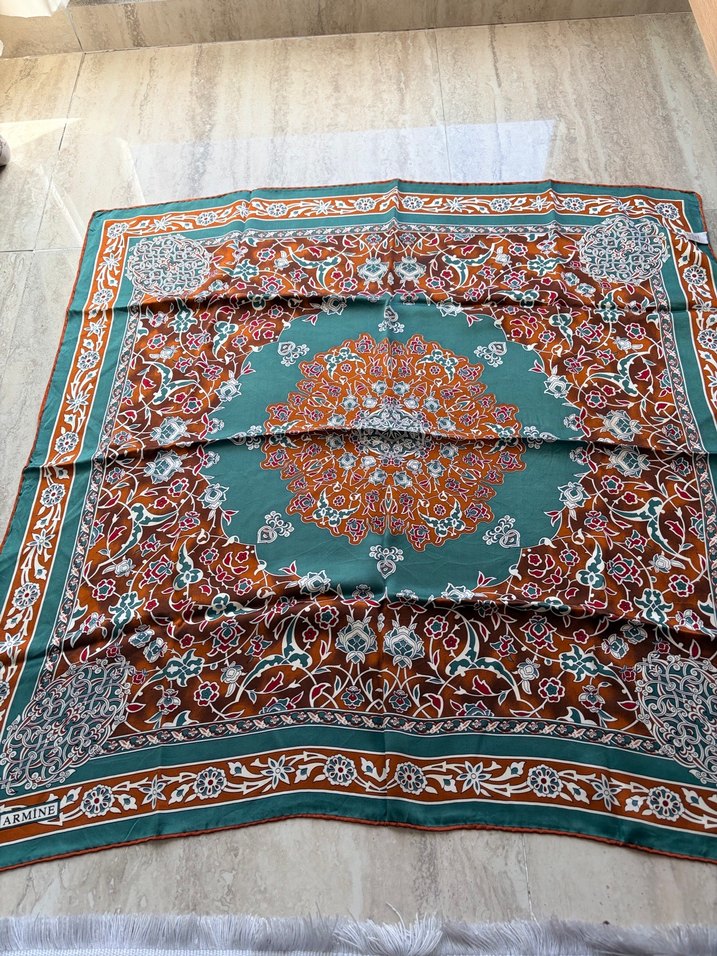 İpek kumaş. Defo yok Koyu çok renkli, bohem desenli, dökümlü tekstil kadın fular. Retro ve hippie tarzlar için uygundur.