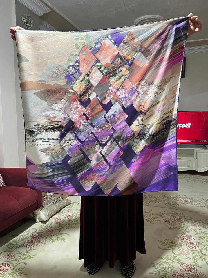 İpek dokusuyla çok renkli, koyu tonlarda, çağdaş avant-garde tarzda drapeli kadın fular. ✨