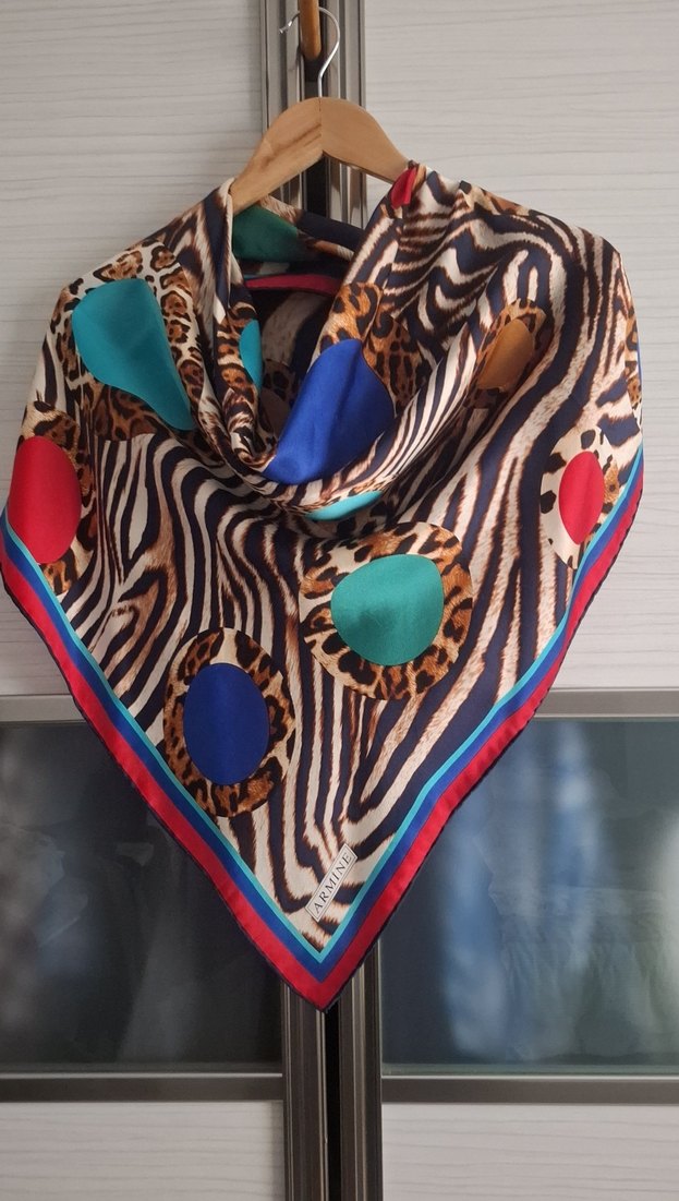 Kadın ipek eşarp, yumuşak ipek kumaştan, hayvan desenleri ve renkli puantiyelerle bohem tarzda tasarıma sahip. Özel günlerde itinalı bir şekilde kullandım, küçük iğne izleri var Kullanıma engel hiçbir durumu yok