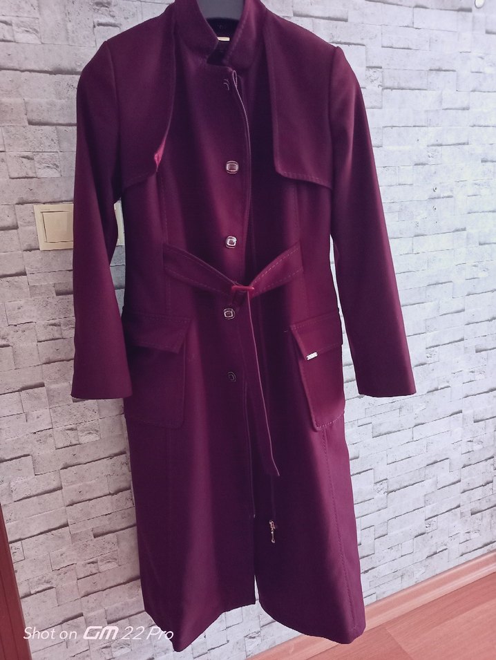 Bordo renkte, uzun kollu, kemerli ve kesimli yaka detaylı kadın kaban. rengi koyu bordo. Resimde biraz açık görülüyor. Düğmeli ama ben fermuar ekledim düğme kısmını iptal ettim o yüzden 40-42 beden uyumlu