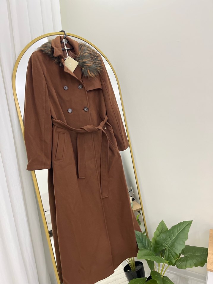 Armine Kahverengi uzun boy kadın kaban, süetten üretilmiş ve kürk detaylıdır. Notlu yaka, uzun kollu ve baskılı desene sahip, klasik zarafeti Paris sokak modasıyla buluşturur. Günlük kullanım için uygundur. Sıfırdır eni 52 cm uzunluk 135 cm