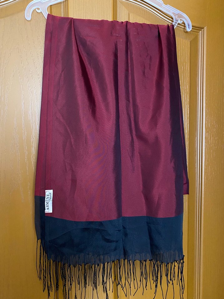 Ürün 2 kez kullanıldı yeni durumda. Bordo ve siyah renklerde, ipek dokulu, püsküllü şal.