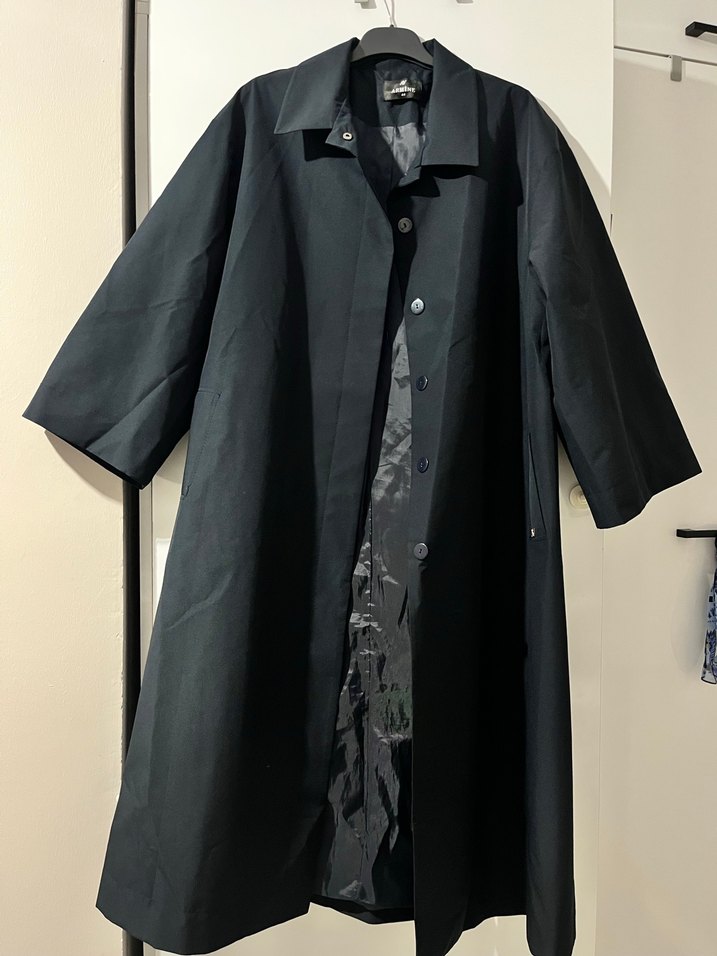 Düğmeli, kısa kollu ve sivri yaka detaylı siyah uzun kadın yağmurluğu, gevşek kesimiyle gotik tarz sunar. Ofis kullanımı için uygundur. ️