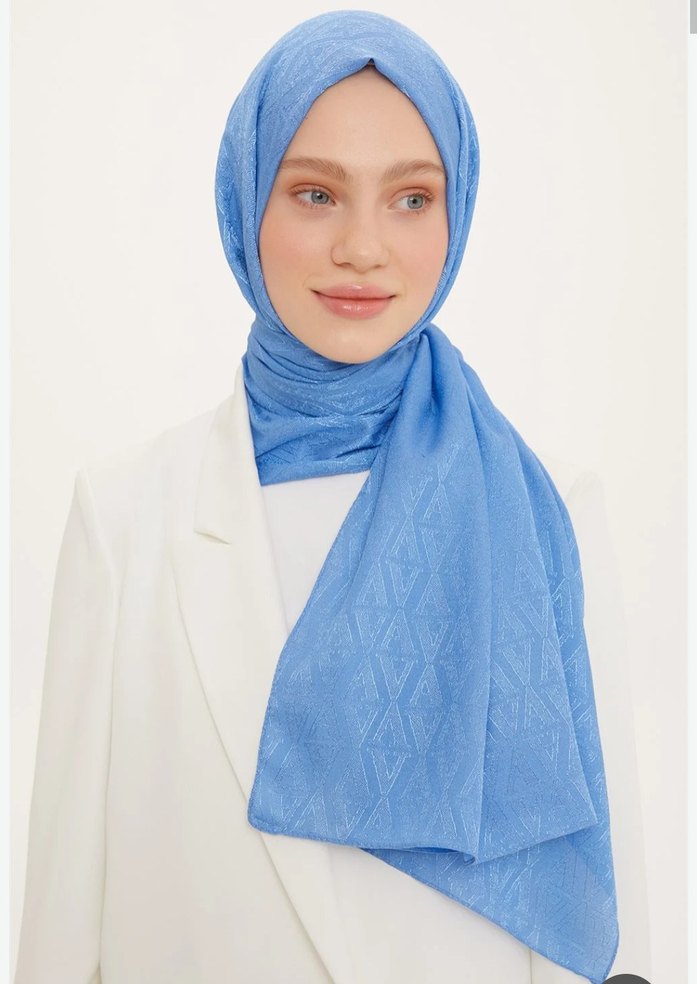 Pastel mavisi, sentetik kumaştan drapeli kadın şal, minimal ve sade tarz için uygundur.