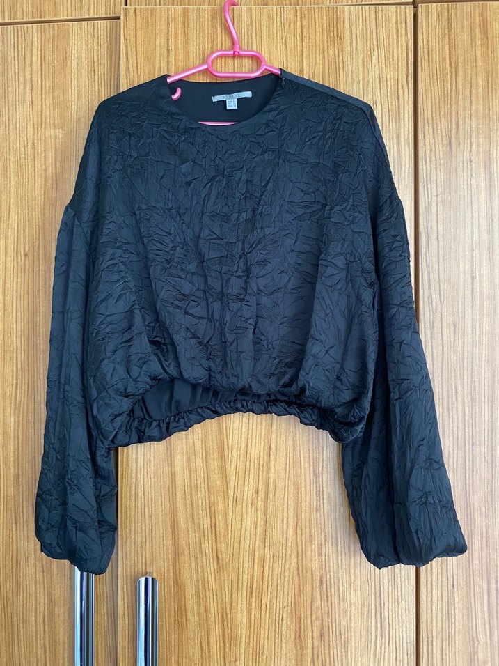 Siyah keten, uzun kollu, yuvarlak yakalı, piliseli ve bol kesim bluz. Normal midi boyda, günlük kullanıma uygun.