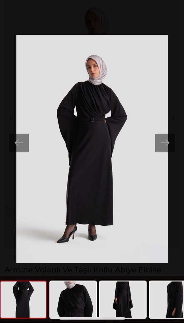 Siyah uzun elbise, yüksek yaka ve taşlı, volanlı uzun kollara sahip. Sentetik kumaştan, günlük kullanıma uygun sade ve şık tasarım.