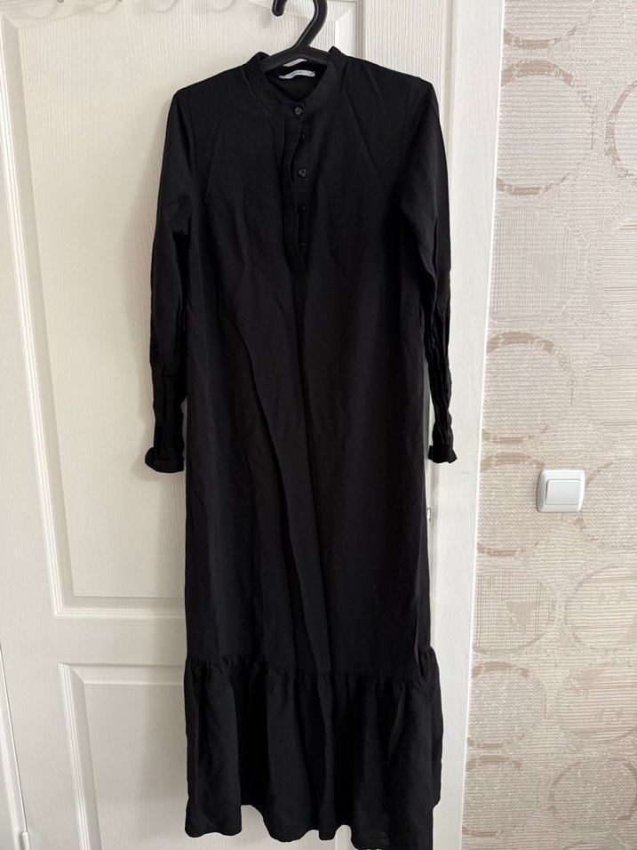Siyah keten uzun elbise, bol kesim, yüksek yaka ve etek kısmında fırfır detayına sahiptir. Uzun kollu ve minimalist gotik tarzda, günlük kullanıma uygundur.