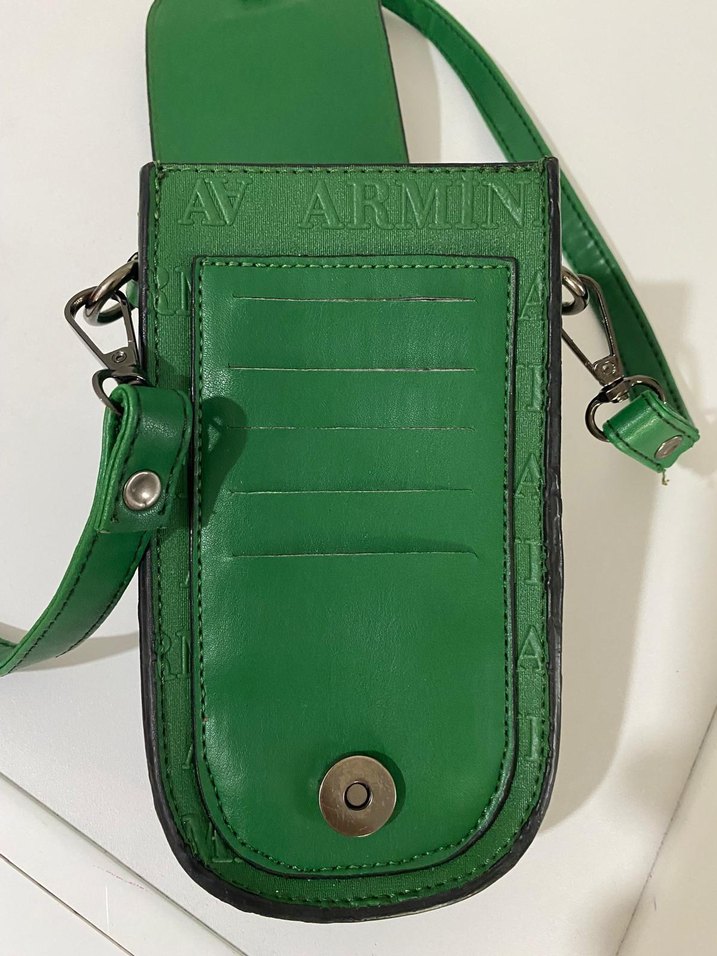 Armine markalı, koyu yeşil deri kadın çapraz çanta, fermuarlı ve baskılı detaylara sahiptir. Günlük sokak stili için uygundur.
