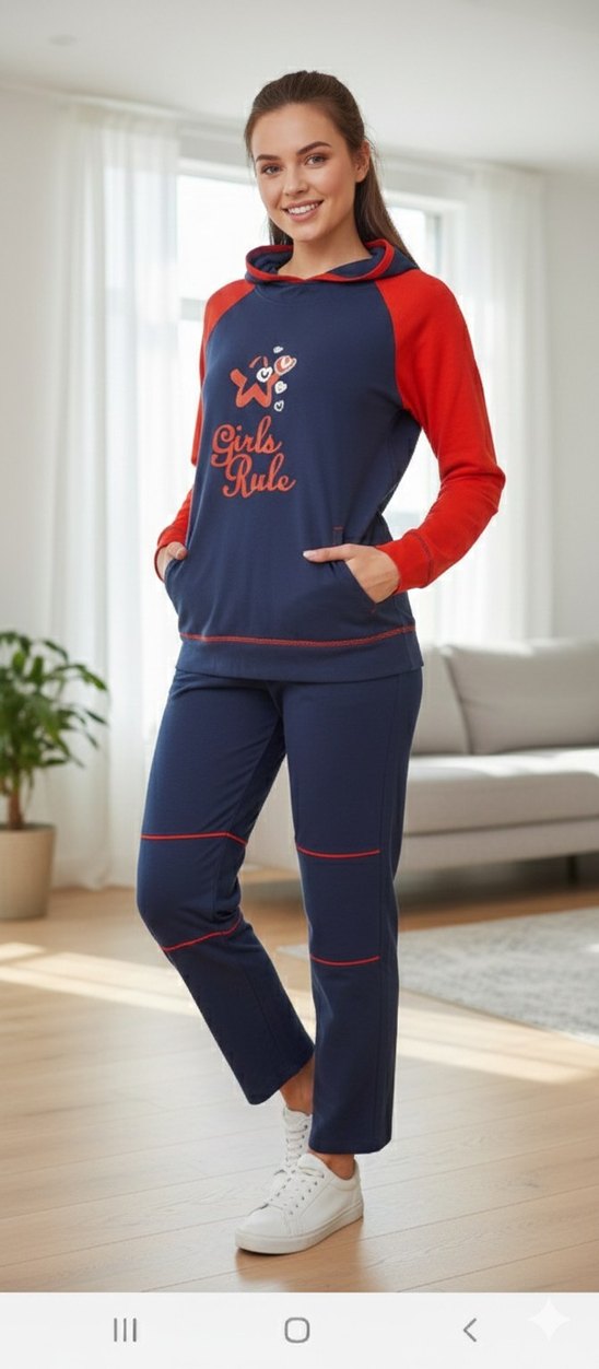 Pamuklu, kapüşonlu, lacivert/ kırmızı renkli pijama takımı