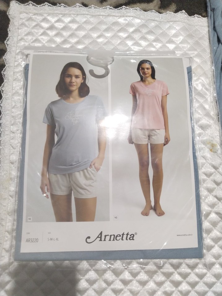 Arnetta markalı, gevşek kesim, kısa kollu, baskılı beyaz mini pijama takımı. Rahat ve hafif yapıdadır.