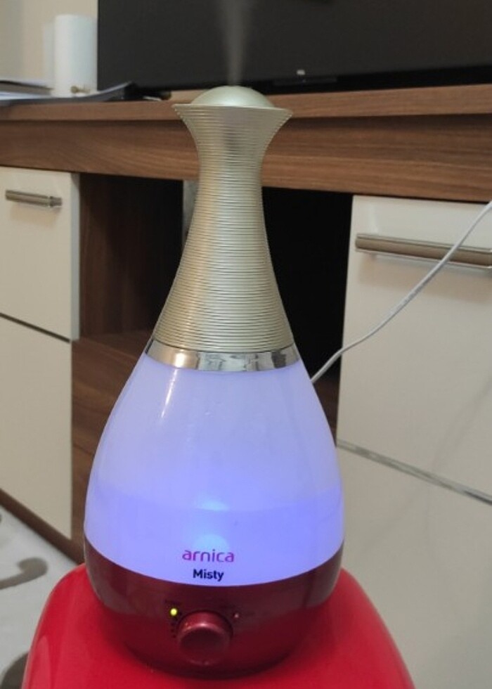 Arnica marka hava nemlendirici buhar makinesi. Haznesine aromatik yağlar damlatarak nemlenen odanız aynı zamanda mis kokar. LED ışık özelliği var. Kullanımı kolay, şık. En ufak hasarı hatta çizgisi bile yok. Orijinal kutusuyla gönderilecektir.