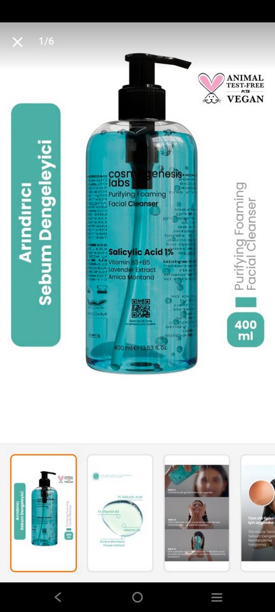 Arnica Montana özlü, %1 salisilik asit içeren köpüren yüz temizleyici. Sebum dengesini sağlayarak cildi temizler, 400 ml şişede sunulur.