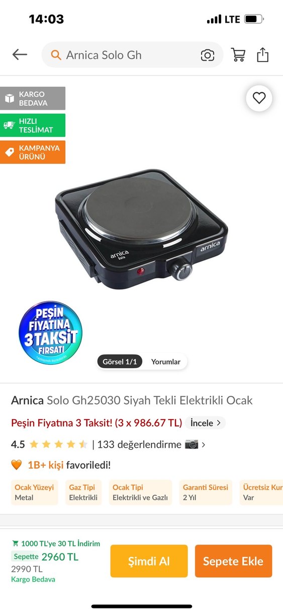 Arnica Solo Siyah Tekli Elektrikli Ocak