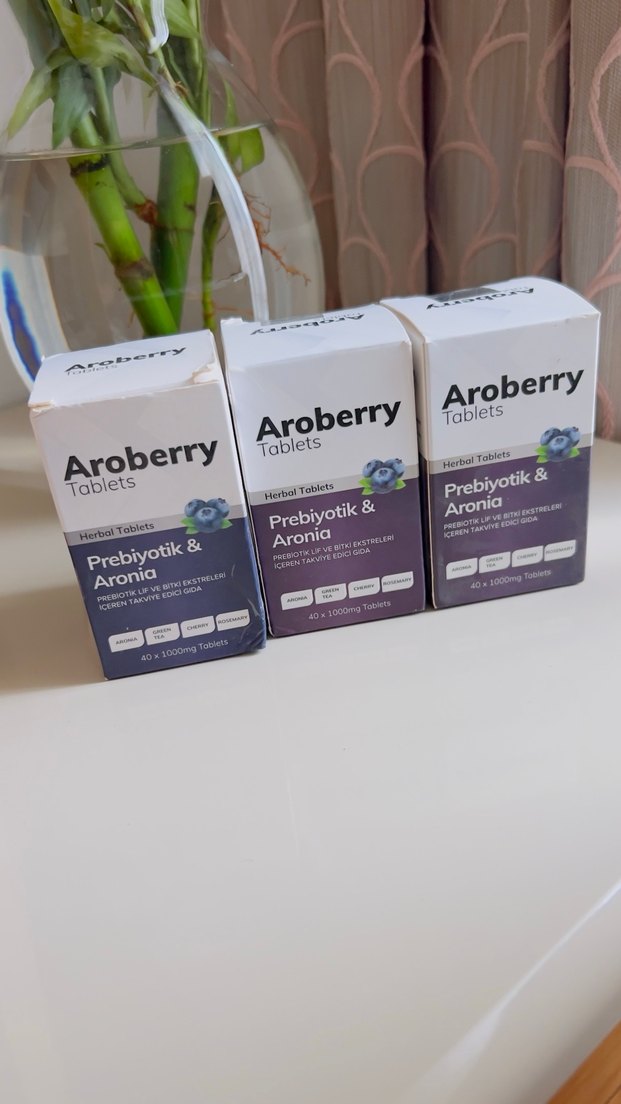 Aroberry Tabletleri, prebiyotik ve aronia ekstresi içerir. 40 tabletlik kutuda sindirim sağlığını destekler.