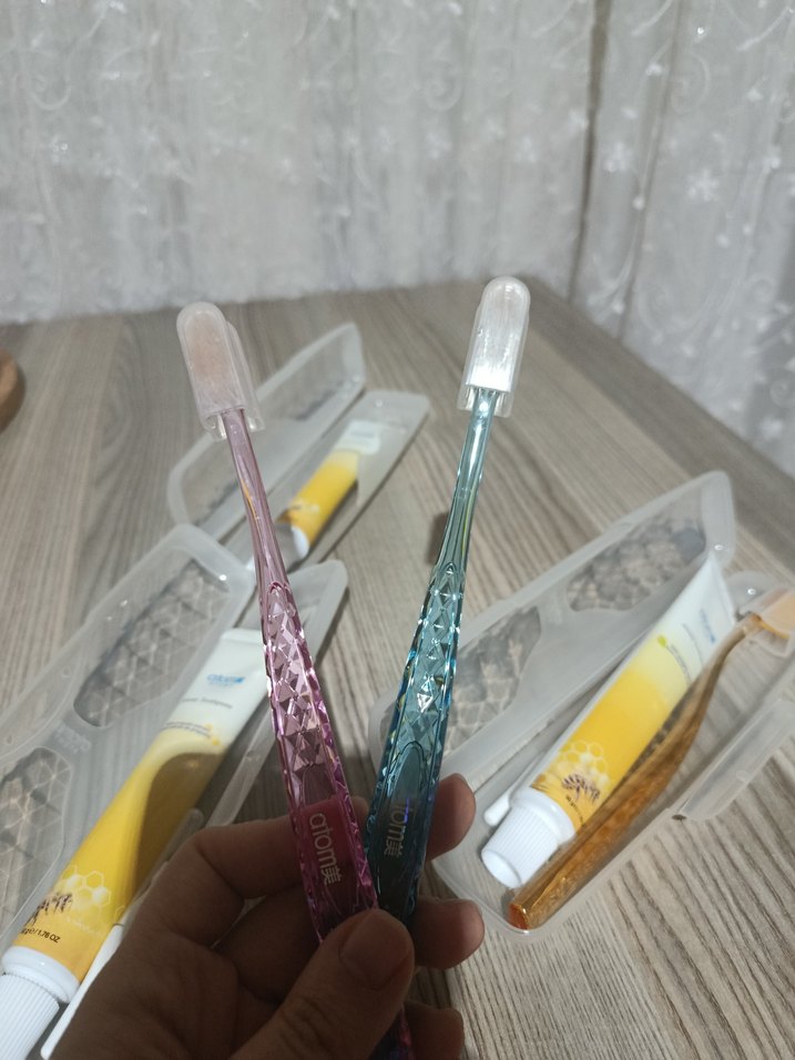 Yumuşak kıllara ve dokulu saplara sahip diş fırçası seti, yanında diş macunu tüpleri ile birlikte. Nazik temizlik ve ferahlık sağlar.