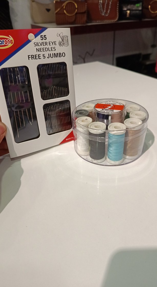 55 adet gümüş gözlü iğne ve çeşitli renklerde ipliklerin bulunduğu yuvarlak kutu seti. Dikiş ve el işi için uygun. ✂️