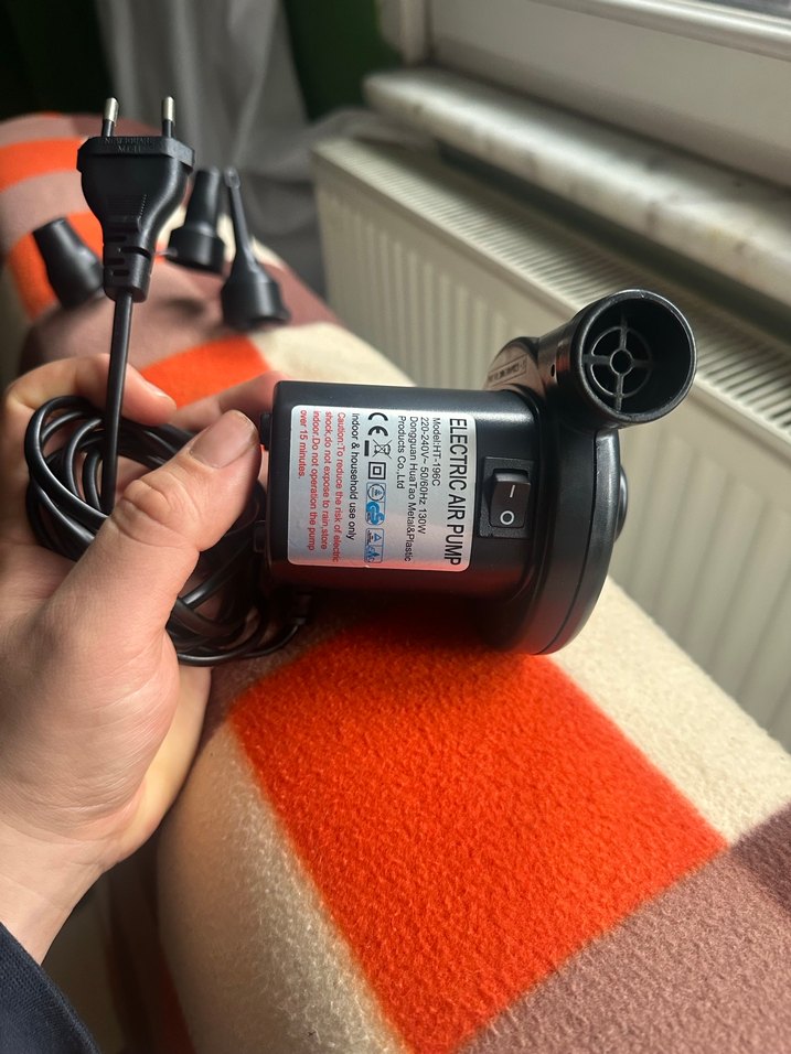 ARPII elektrikli hava pompası, siyah renkte kompakt tasarıma sahip ve renkli detaylar içerir. Kablo ile çalışır, çeşitli eşyaları(Havuz yatağı, Kamp Yatağı Havuz, Bot) şişirmek için uygundur. 3 adet başlığı mevcuttur. Vakum özelliği vardır. Sadece birkaç kez kullanıldı.