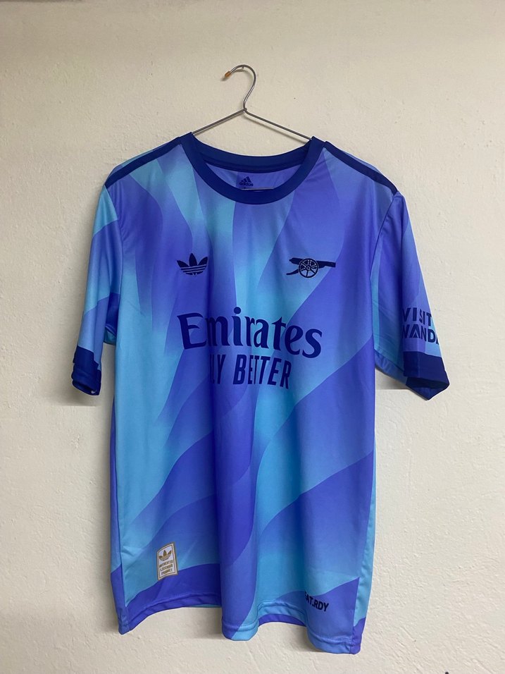 Sentetik kumaştan, kısa kollu, bol kesim ve yuvarlak yaka, koyu mavi baskılı erkek forma. Günlük kullanıma uygun rahat bir parça.