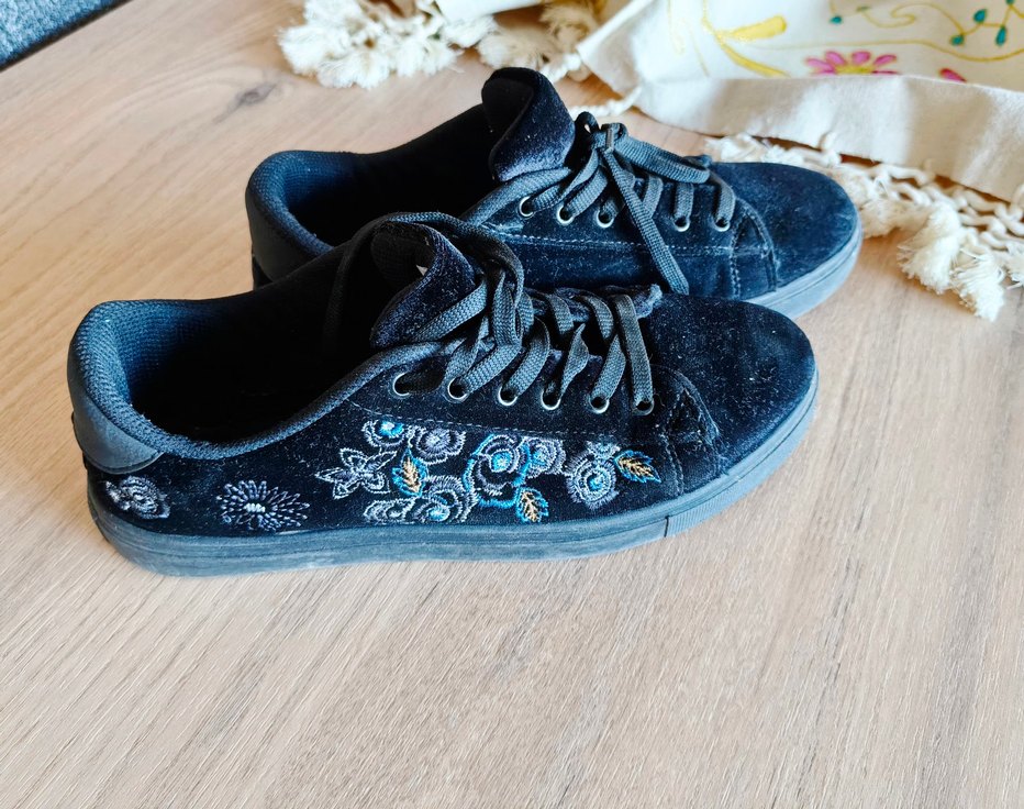 Nakışlı detaylara sahip lacivert kot kadın spor ayakkabısı, stiletto topuklu ve bağcıklı tasarımla şehir stiline uygun. Günlük kullanıma uygundur.