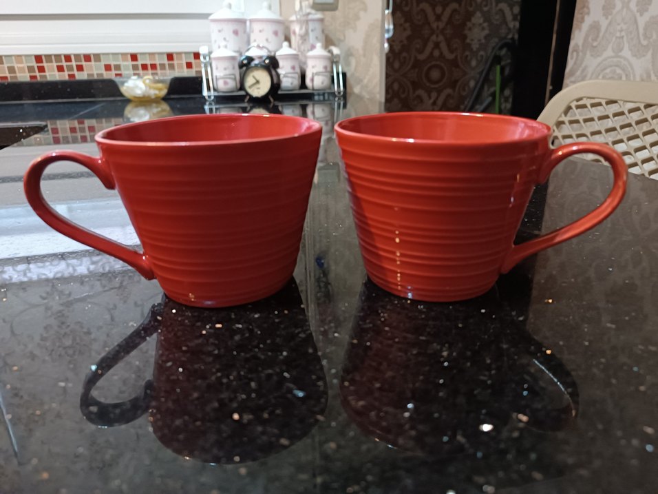 İki adet kırmızı renkli, renkli ve kabartmalı desenli seramik kuoa. Parlak yüzeye ve canlı görünüme sahiptir.