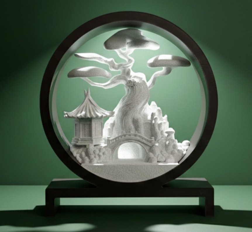 Yuvarlak çerçeveli, içinde ağaç, köprü ve küçük bir köşkün bulunduğu dekoratif figürin. Açık yeşil arka plan ile sunulmuştur.