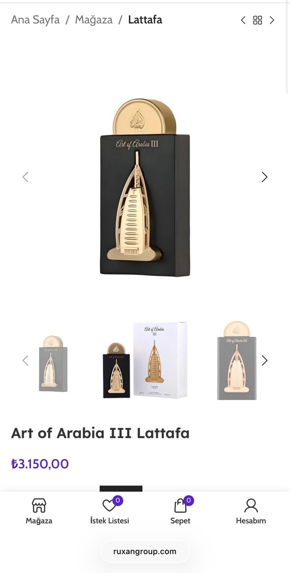 Art of Arabia III Lattafa, Arap mimarisinden esinlenen şık siyah ve altın renkli tasarıma sahip parfümdür. Orjinal lattafa hologramlı