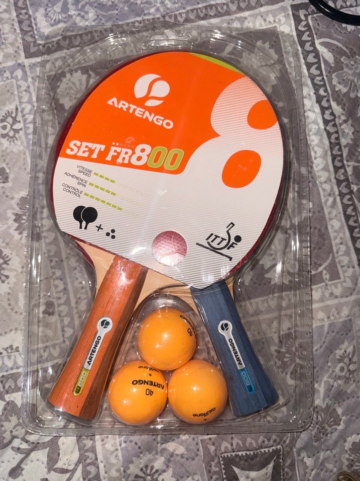 Artengo FR800 masa tenisi seti, iki renkli raket ve üç turuncu top içerir. Artengo FR 800 Masa Tenisi Seti – Sıfır / Ambalajlı Artengo FR 800 masa tenisi seti. Set içinde 2 adet raket + 3 adet top bulunmaktadır. Ürün hiç kullanılmamış, orijinal ambalajındadır. FR 800 modeli; • Hız, spin ve kontrol dengesi iyi • Hem yeni başlayanlar hem de hobi amaçlı oynayanlar için uygundur Bu tarz set fiyatlarının satış fiyatı yaklaşık 1.000 TL civarındadır. Kesin alıcıya pazarlık açıktır
