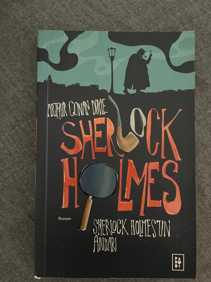 Arthur Conan Doyle'un dedektif romanı, kapakta Sherlock Holmes'un silueti ve büyüteç ile tasvir edilmiştir. ️♂️