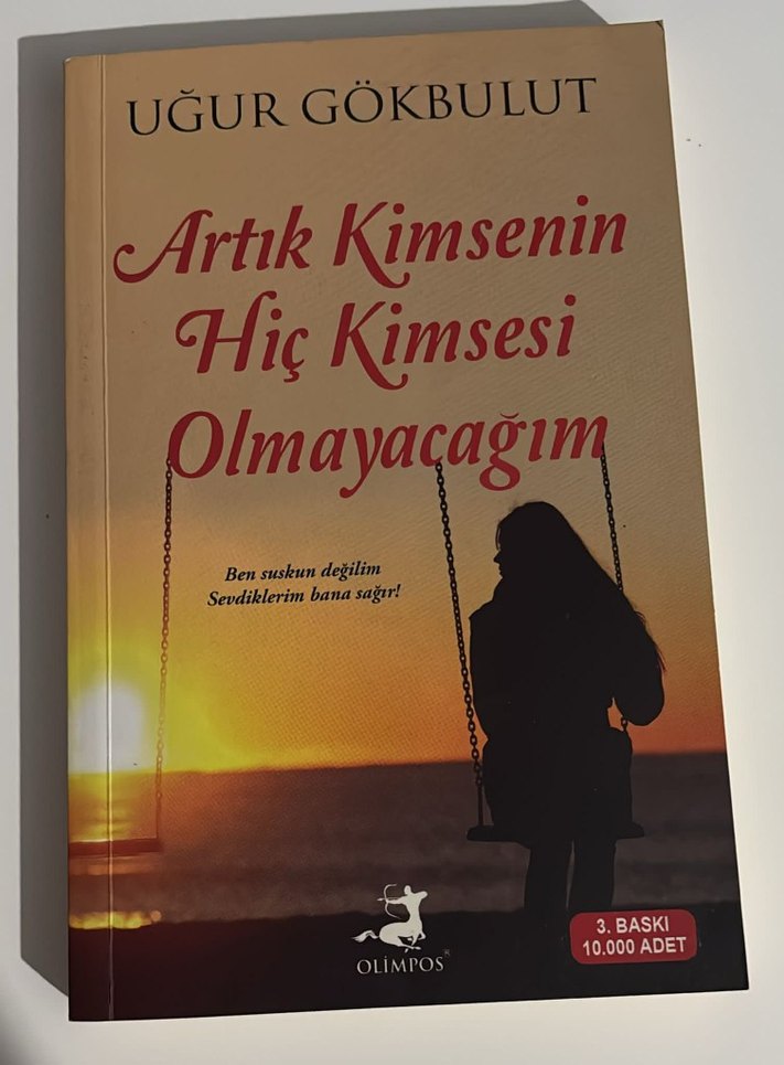 Uğur Gökbulut'un "Artık Kimsenin Hiç Kimsesi Olmayacağım" adlı romanı, gün batımı kapaklı, 3. baskı "Ben suskun değilim, sevdiklerim bana sağlar" ifadesi yer alıyor.